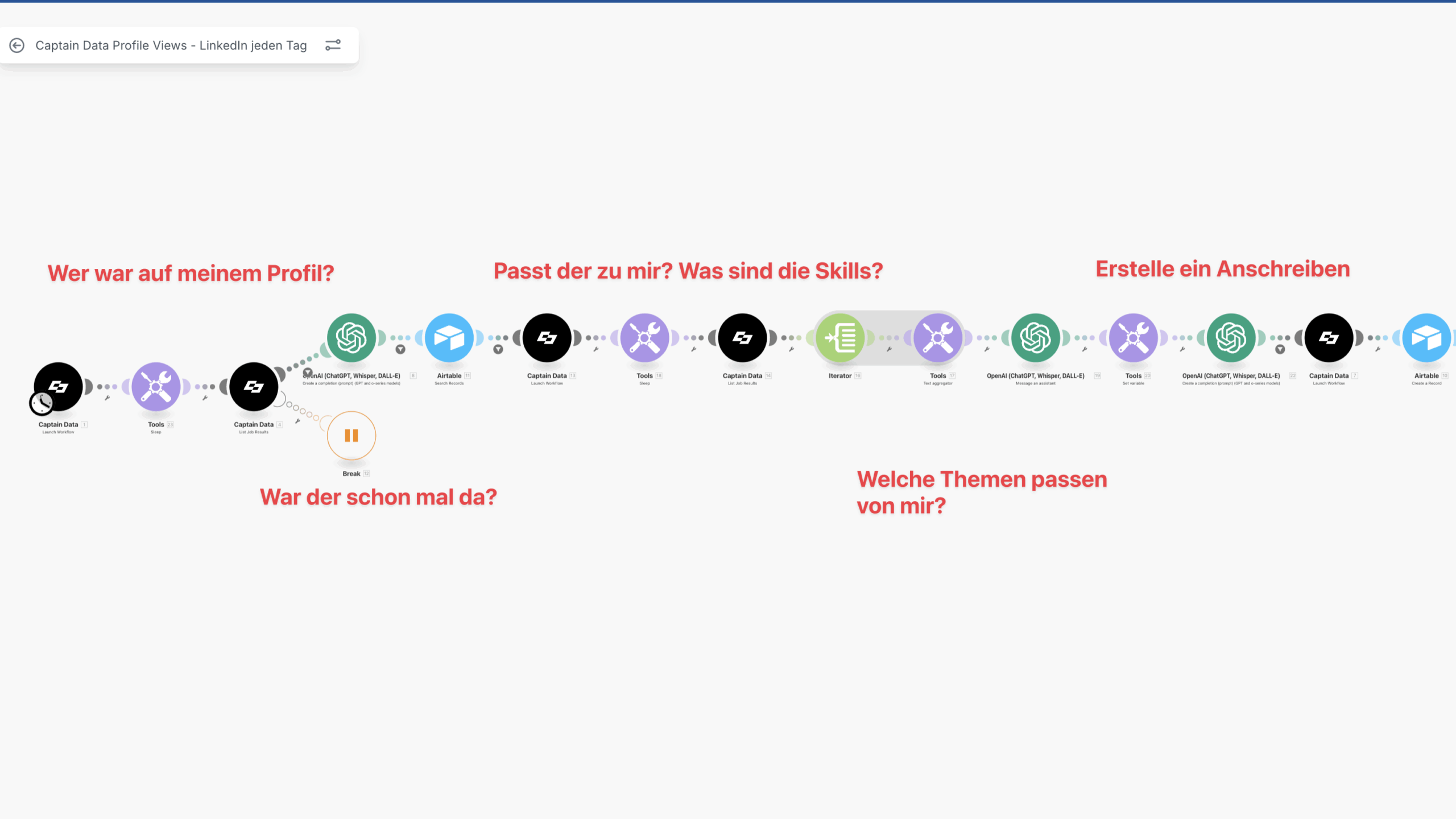 Handle with Care, der Workflow verstößt gegen die Nutzungsbedingungen von LinkedIn falls Ihr den ausführen wollt, dann vorher die Risiken klar verstehen.