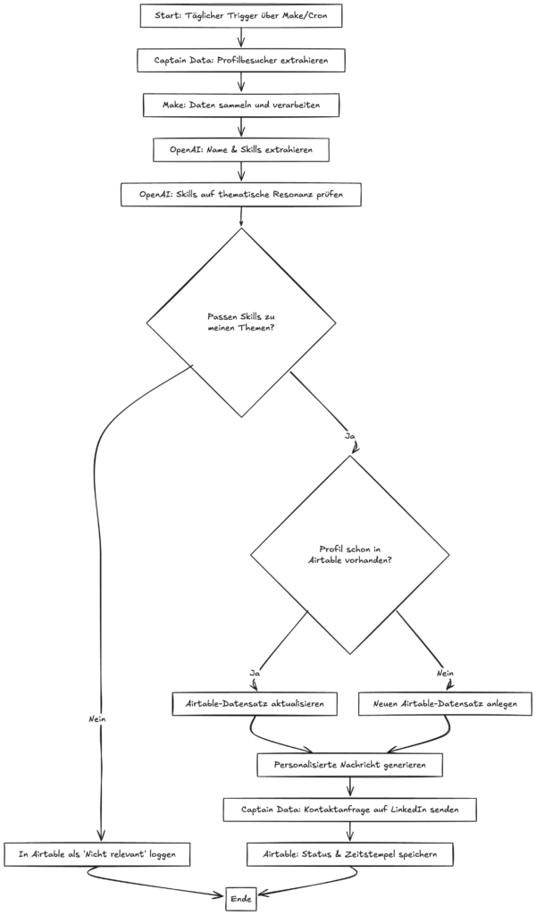 • Tägliche Ausführung – der Workflow läuft im Hintergrund und hält mein LinkedIn-Netzwerk permanent im Aufbau.
